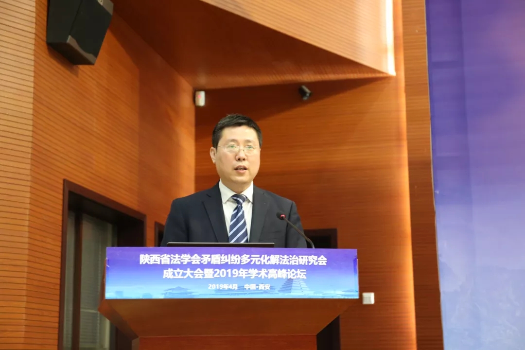 陕西省法学会党组书记、副会长杨建军向陕西省法学会矛盾纠纷多元化解法治研究会授牌,并代表省法学会对研究会的成立表示热烈的祝贺!杨建军对本研究会校企合办的创新特点给予了高度认可,并倡导通过举办学术沙龙或者研讨会,增强学术氛围,积极响应党的号召,回应人民的呼声,满足人民群众的需要。