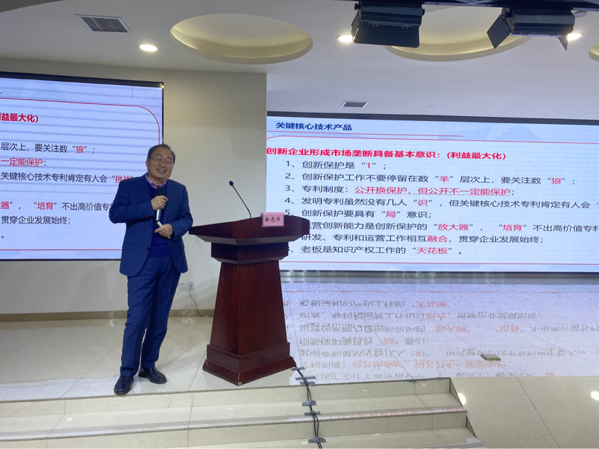 培训班的第二场专题报告由西安市千沃知识产权代理事务所、西安点申知识产权代理有限公司负责人徐选怀老师主讲,主题为“创新企业上市知识产权管理策略”。徐选怀老师首先从国家政策层面、证券市场层面、投资资本层面介绍了上市创新企业知识产权要求,然后结合案例从垄断性、先进性、迭代性方面分析了创新型企业关键核心技术,最后徐老师通过对实践案例分析,从毛利率、市场认可度、市场替代性方面详细讲解了关键核心产品,提出利用资本市场不断融资,专精特新中小企业在拥有关键核心技术的基础上,形成产业链关键环节的关键核心产品,并在该细分市场上形成以技术垄断为基础,做强做大。