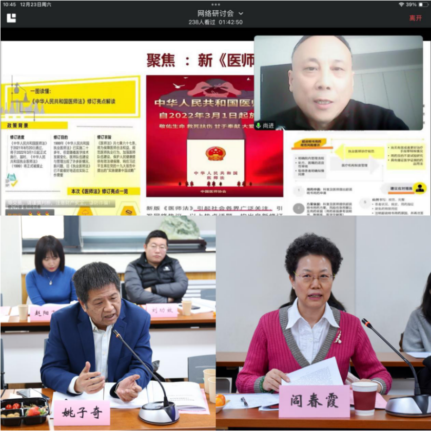西安市第四医院乳腺外科主任尚进主任医师以线上分享的形式作了题为《试论医疗执业权—基于〈医师法〉第22条第1款的研究》的学术报告。与谈人西安市律师协会会长姚子奇律师、西安交通大学法医学院阎春霞教授对尚进主任医师的报告从不同角度做出了精彩的点评,都表示认同尚进主任的观点,并结合各自的领域提出了真知灼见。