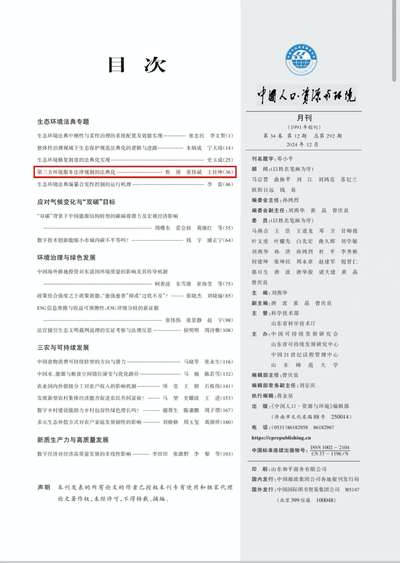 近日,我院环境法研究团队青年教师焦琰博士、硕士研究生张伟斌、王社坤教授(通讯作者)的论文《第三方环境服务法律规制的法典化》在CSSCI来源期刊《中国人口·资源与环境》2024年第12期发表。