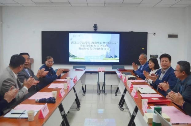 4月21日上午十点,我院与海南华宜财经研究院全面合作框架协议签约暨硕士研究生实务导师聘任仪式在西学楼北0906会议室顺利举行。中国财税法研究会副会长、海南华宜财经研究院顾问贾绍华,国家税务总局宝鸡市税务局副局长姚鑑,国家税务总局西安市税务局科研所副所长杨溪,国家税务总局西安市灞桥区税务局总会计师张国防,以及学院党委书记李一凡、副书记丁晓雯,副院长代水平、崔玲玲、许博,学校“一带一路”税法研究中心主任、学院教授王鸿貌,经济法学教研部侯欢参加此次签约仪式。